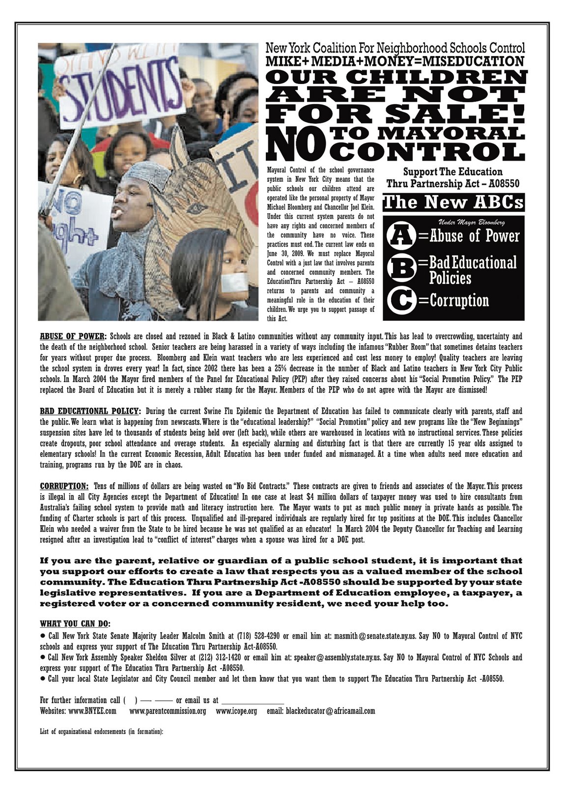 Basir Mchawi of the WBAI show, Education At the Crossroads, is looking for endorsers to the attached AD against mayoral control. We need individuals and organizations to sign on. We also need some donations to make this happen. To date we have identified the Amsterdam News and Brooklyn’s Our Time Press as conduits for the ad.