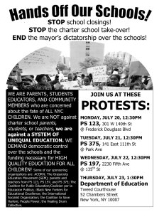 “GEM Organizers, united with the Charter-Invaded Harlem Public School Communities and ACORN, encourage everyone to bring signs, banners and leaflets as we organize to educate our Harlem community about the injustices of Charter Schools, dictatorial mayoral control & the DOE.”
