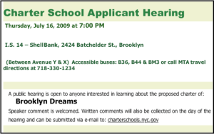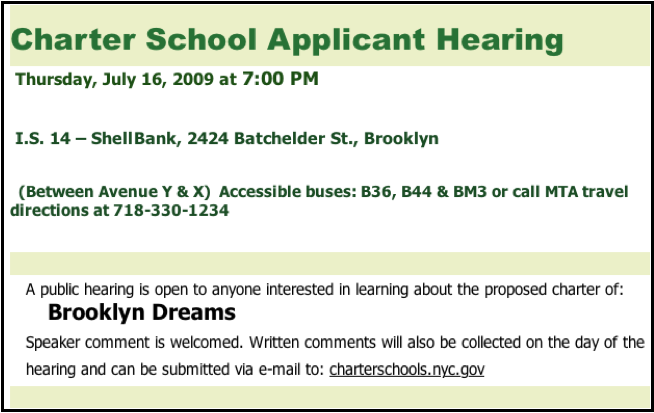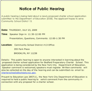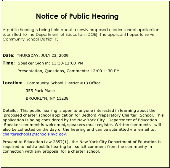 Pursuant to Education Law 2857(1), the New York City Department of Education is required to hold a public hearing to solicit comment from the Community in connection with any proposal for a charter school