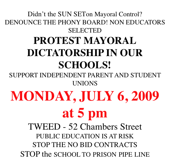 A number of local groups who have been lobbying in Albany and advocating for an end to mayoral control are meeting on Friday, July 10, at 6 PM, at DC 37 Headquarters, 125 Barclay Street (off the West Side Highway, near Chambers on the ACE and 123) to collaborate on a strategy going forward. These include the organizers of last Monday’s rally, listed below.