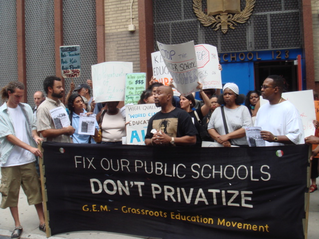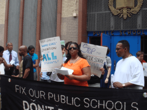 GEM joined with parent activists yesterday at PS 123 for another protest against the placing of a Moskowitz charter school in an existing public school. The speakers kept hammering the point they’ve been making at earlier demonstrations in front of the school, that quality education should not just be for some children, but for all children.
