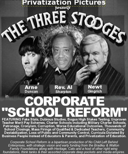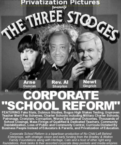Since the public debates on charter schools and privatizing education are ones that our elite cannot win, they have decreed there will be no debate. Instead of an honest public examination of the disastrous impact of No Child Left Behind, and its attendant decade of creeping educational privatization, corporate media, the Obama administration and its bipartisan allies are sending in the clowns with a 21st century three stooges remake starring the Rev. Al Sharpton, along with Republican former Speaker Newt Gingrich and Obama Secretary of Education Arne Duncan, elbowing and slapping at each other, yukking it up about their supposed political differences while they all come together around the corporate elite’s version of “school reform.”