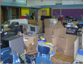 Upon returning to work this Tuesday, tensions flared up again when PS 123 teachers found their first and second floor rooms and corridors in an unwieldy mess (right). As the HSA charter took over the third floor this summer, their movers had evicted the PS 123 teacher materials and consequently left PS 123 books and supplies in disarray. The DOE, UFT officials, and politicians, all of whom had been apprised of the impending chaos, did nothing over the summer. At the start of this new school year, the HSA charter had its entire third floor facilities immaculately cleaned, freshly painted and newly supplied with modern lighting fixtures, toilets, doors, furniture, air conditioning, rugs and smart-board computer technology. HSA also has smaller class sizes.
