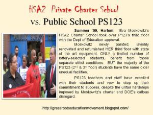 The following photo essay shows the unjust and unequal conditions facing PS 123. The DOE’s imposition of a private-charter school at the public PS 123 has divided the community there.