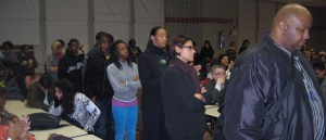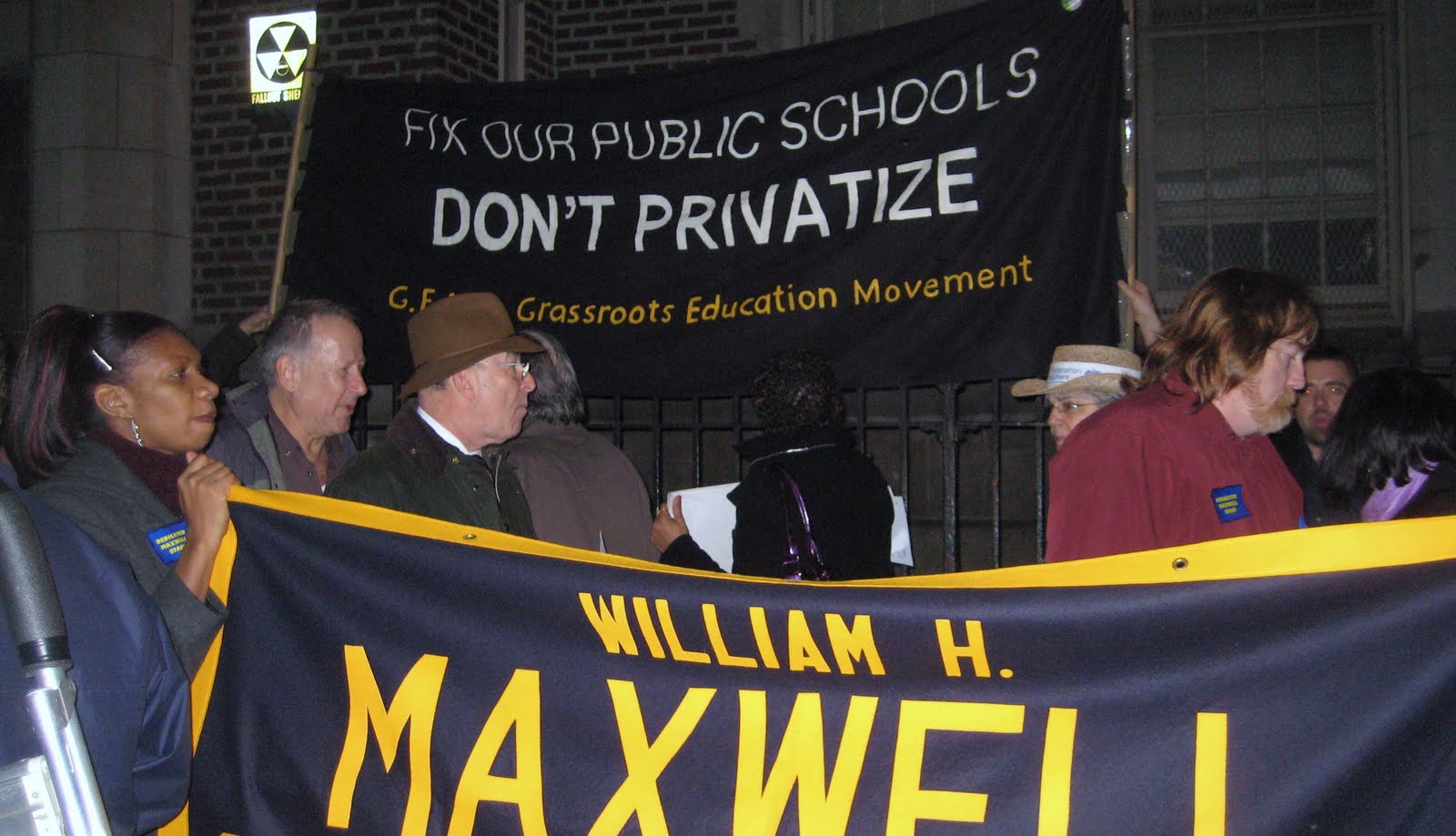 Mayor Bloomberg announced the closing of over 20 public schools. The community voiced its outrage. Activists denounced this callous ploy to give away public school space to private charter schools. Over 250 people protested outside and then again inside the cafeteria-forum against the complicity of the District Superintendent.