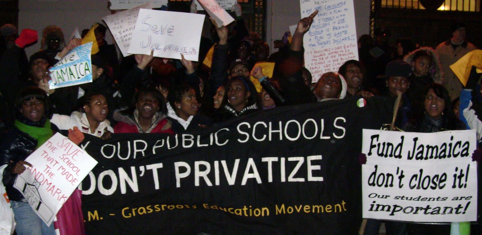 Finally, we in Jamaica High School, the teachers, secretaries, others we have been able to win some victories, we have that experience. May be this time we can win some more. The struggle to save public education. The fight is not over.
