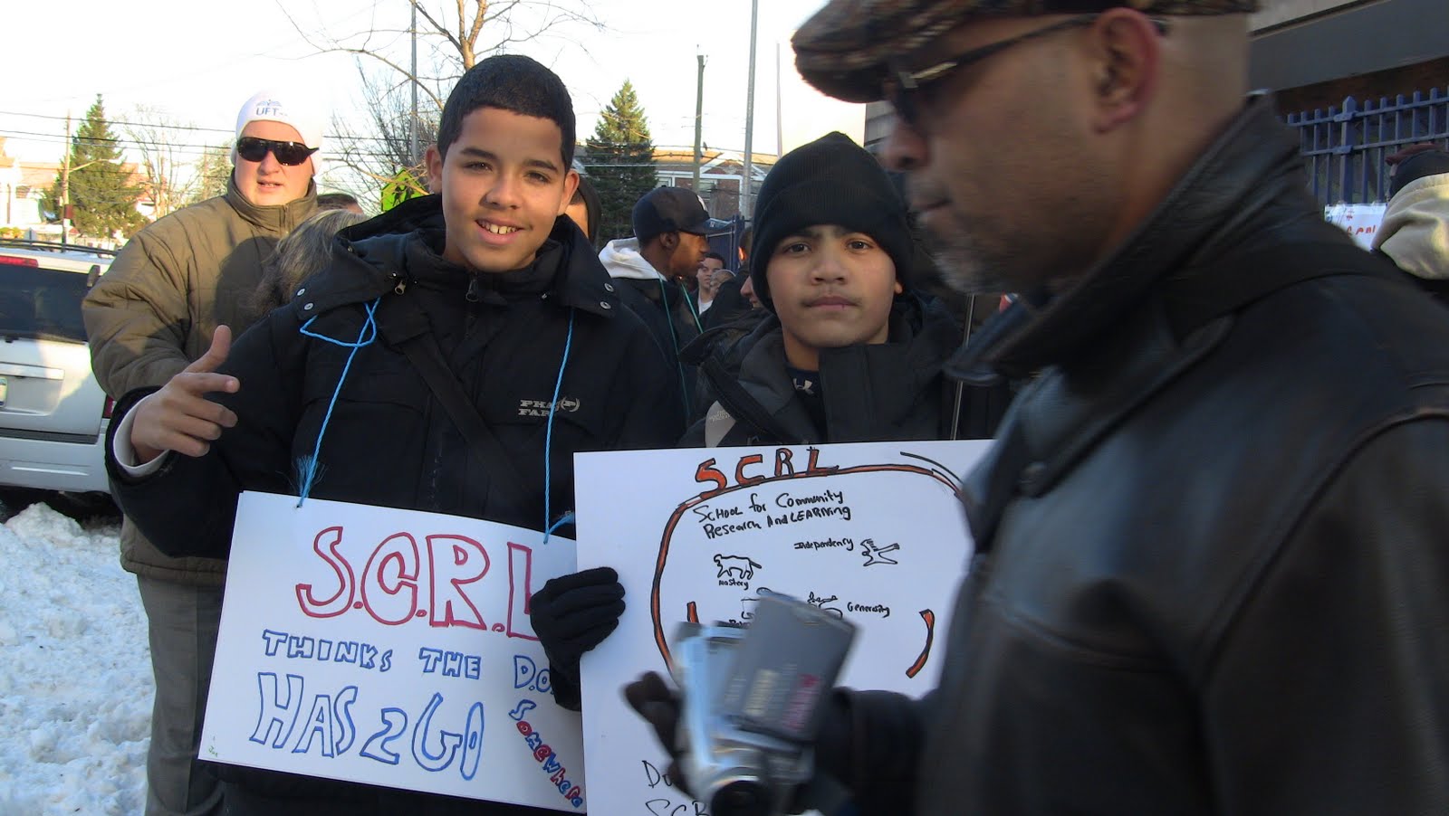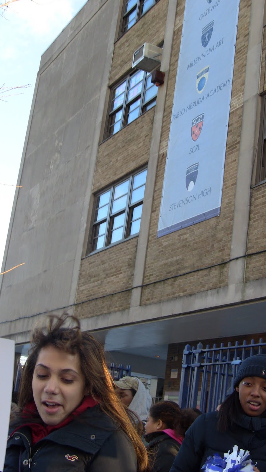 At the High School for Community Research & Learning over 100 protesters, mostly students, loudly voiced their anger at the Department of Education’s (DOE) notice to close them down. Students filed out in front of their Stevenson Building in the bitter cold with hand-made signs, some which read, “SCRL did not fail, the DOE failed us”, “Phase-out is not a solution” and “Money for War, Money for Stadiums But No Money for Education”. As this energetic crowd picketed up and down the sidewalk, they chanted loudly “Save Our School” and vowed to raise outrage at their DOE “hearing” on Jan. 5 at SCRL High. Click on title for video.