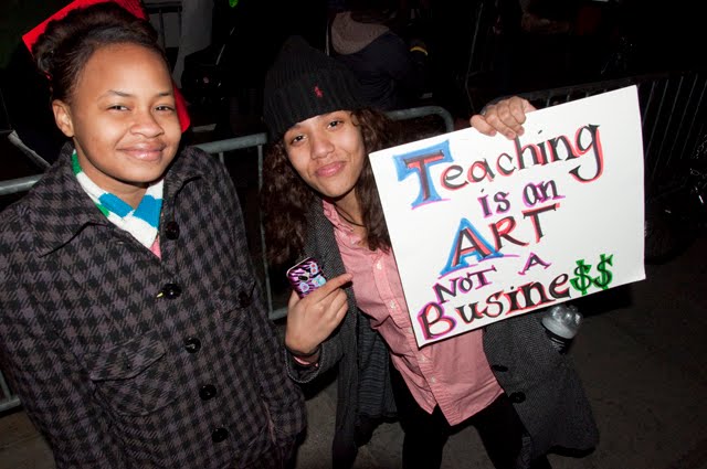 The Mayor’s block on East 79th Street was packed on Thursday evening with New York City students, parents and teachers who are furious over Mayor Bloomberg’s overt attempt to undermine public education. Closing 22 more schools and giving public school space to charter schools are two of the many destructive tactics being utilized by the Mayor.