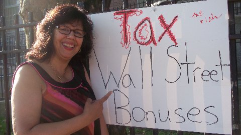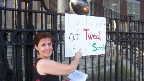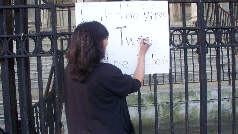 JAMILLAH SALLAHUDDIN, UFT MEMBER PUTS UP SIGNS IN FRONT OF PS202 @ 6:30 AM ON JUNE 4, 2010