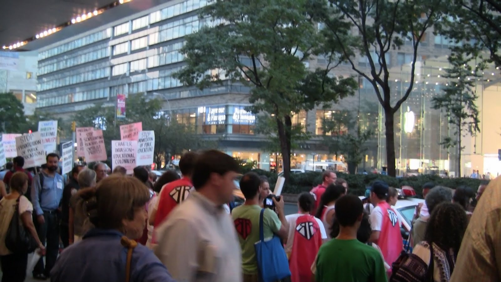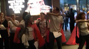 The GEM-NYCORE protesters included a caped-hero-street-theatre troup that rapped lyrics to educate ingoing/outgoing crowds about the film’s pro-privatization, pro-charter fraud.